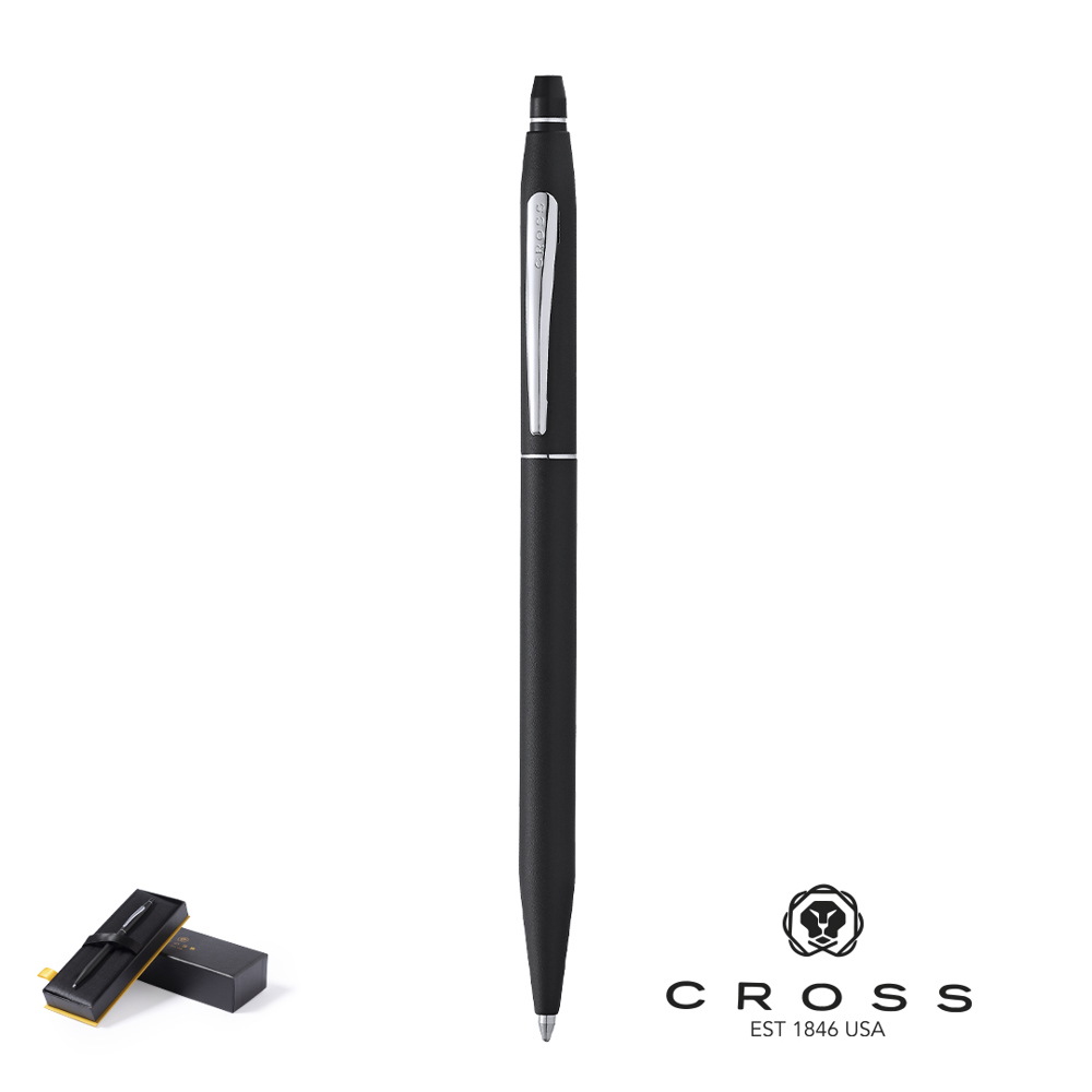 Kugelschreiber Cross Classik Click, der die ikonische Cross-Silhouette mit einem schnellen, versenkbaren Klickmechanismus und einem glatten Metallschaft kombiniert. Jumbo-Patrone in schwarzer Tinte. Präsentiert in einem eleganten, schwarzen Etui mit Markenlogo und weichem Wildlederfutter.