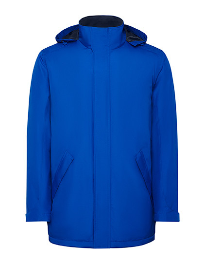 Recycelter Polyester | Wasserdichter und gefütterter Parka | Hoher Kragen mit faltbarer Kapuze und Klettverschluss | Dazu passender zentraler Reißverschluss mit Patte | Seitentaschen mit Reißverschluss und fester Patte | Innentasche mit Klettverschluss | Verstellbare Manschetten mit Klettverschluss | Veredelungszugang auf dem Rücken und der linken Brust