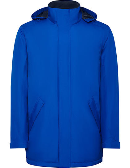 Recycelter Polyester | Wasserdichter und gefütterter Parka | Hoher Kragen mit faltbarer Kapuze und Klettverschluss | Dazu passender zentraler Reißverschluss mit Patte | Seitentaschen mit Reißverschluss und fester Patte | Innentasche mit Klettverschluss | Verstellbare Manschetten mit Klettverschluss | Veredelungszugang auf dem Rücken und der linken Brust