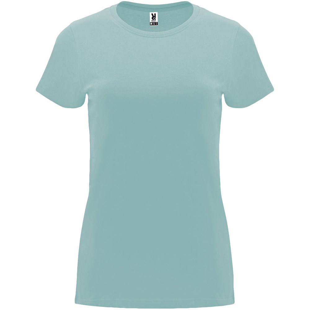 Tailliertes kurzärmeliges T-Shirt für Damen. Rundhalsausschnitt mit 1×1 Rippstrick. Verstärkte und verdeckte Nähte am Kragen. Herausnehmbares Etikett.