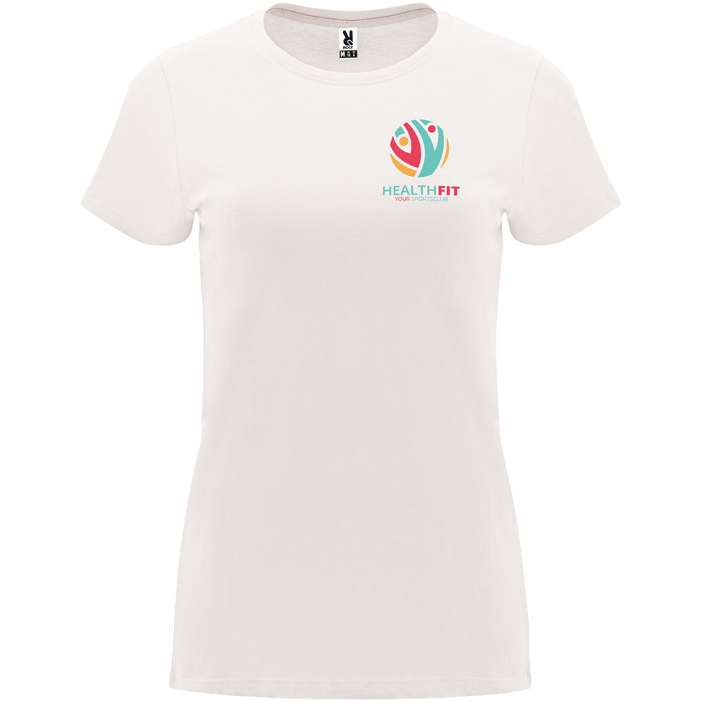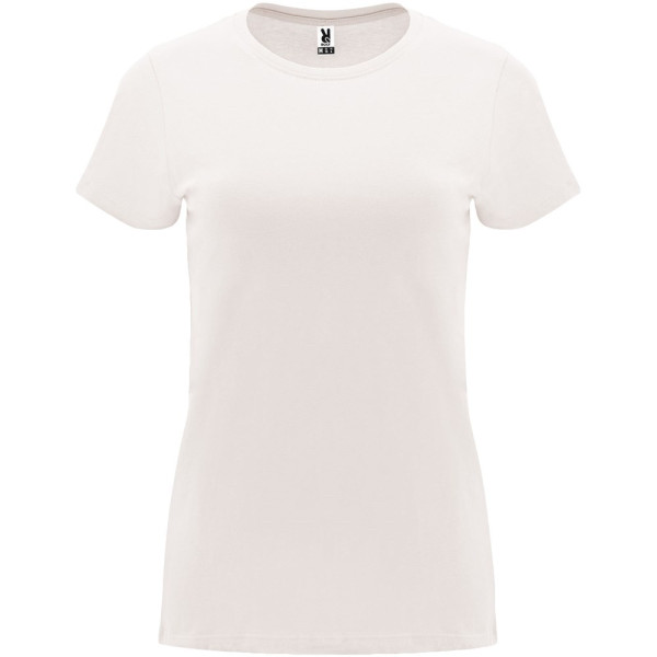 Tailliertes kurzärmeliges T-Shirt für Damen. Rundhalsausschnitt mit 1×1 Rippstrick. Verstärkte und verdeckte Nähte am Kragen. Herausnehmbares Etikett.