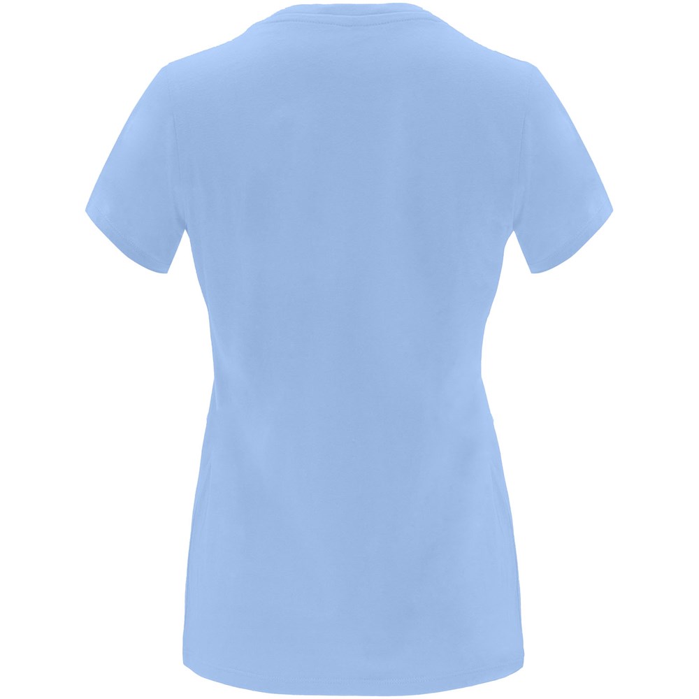 Tailliertes kurzärmeliges T-Shirt für Damen. Rundhalsausschnitt mit 1×1 Rippstrick. Verstärkte und verdeckte Nähte am Kragen. Herausnehmbares Etikett.