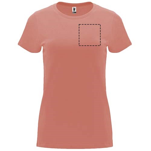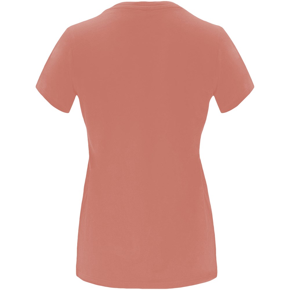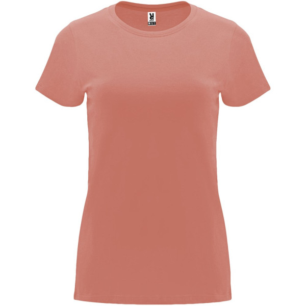 Tailliertes kurzärmeliges T-Shirt für Damen. Rundhalsausschnitt mit 1×1 Rippstrick. Verstärkte und verdeckte Nähte am Kragen. Herausnehmbares Etikett.