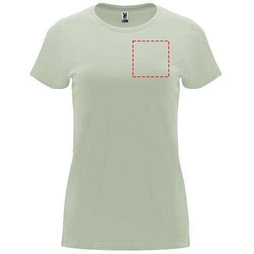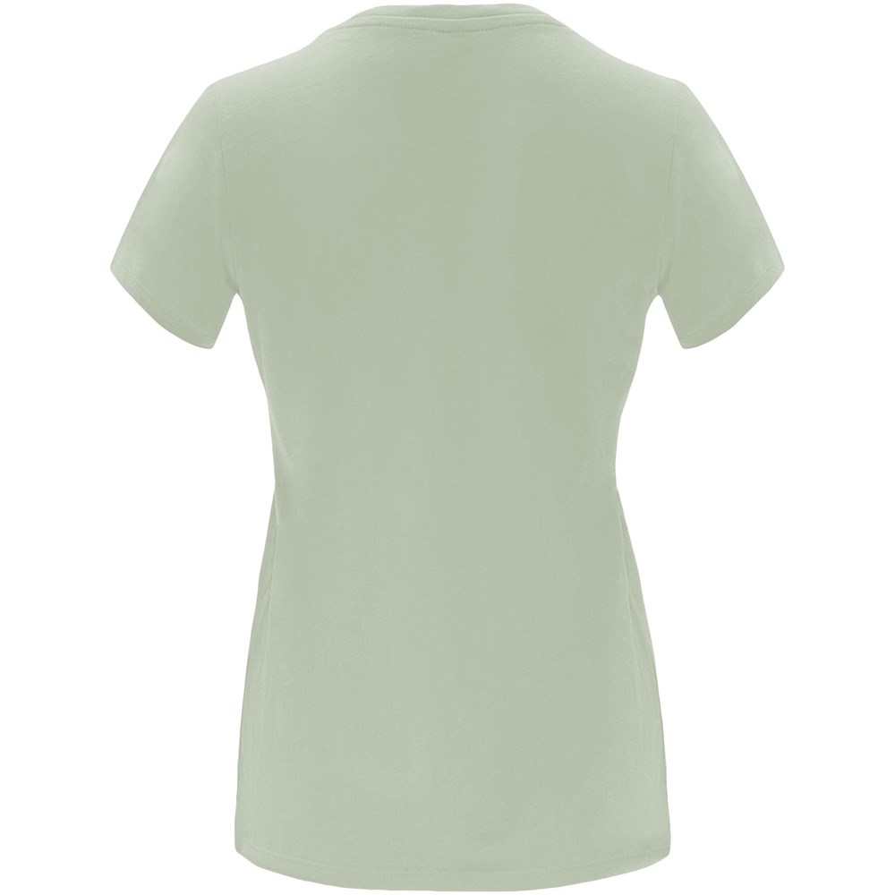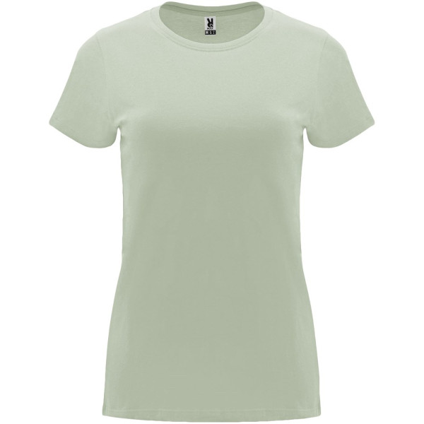 Tailliertes kurzärmeliges T-Shirt für Damen. Rundhalsausschnitt mit 1×1 Rippstrick. Verstärkte und verdeckte Nähte am Kragen. Herausnehmbares Etikett.