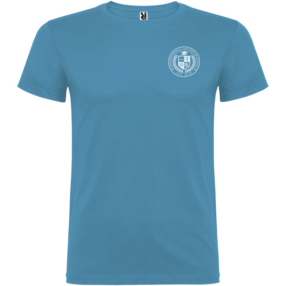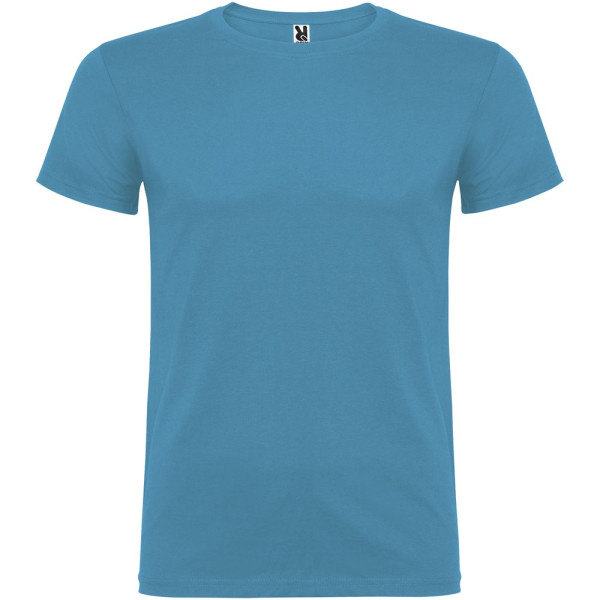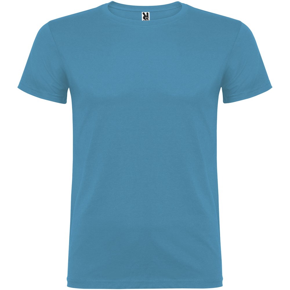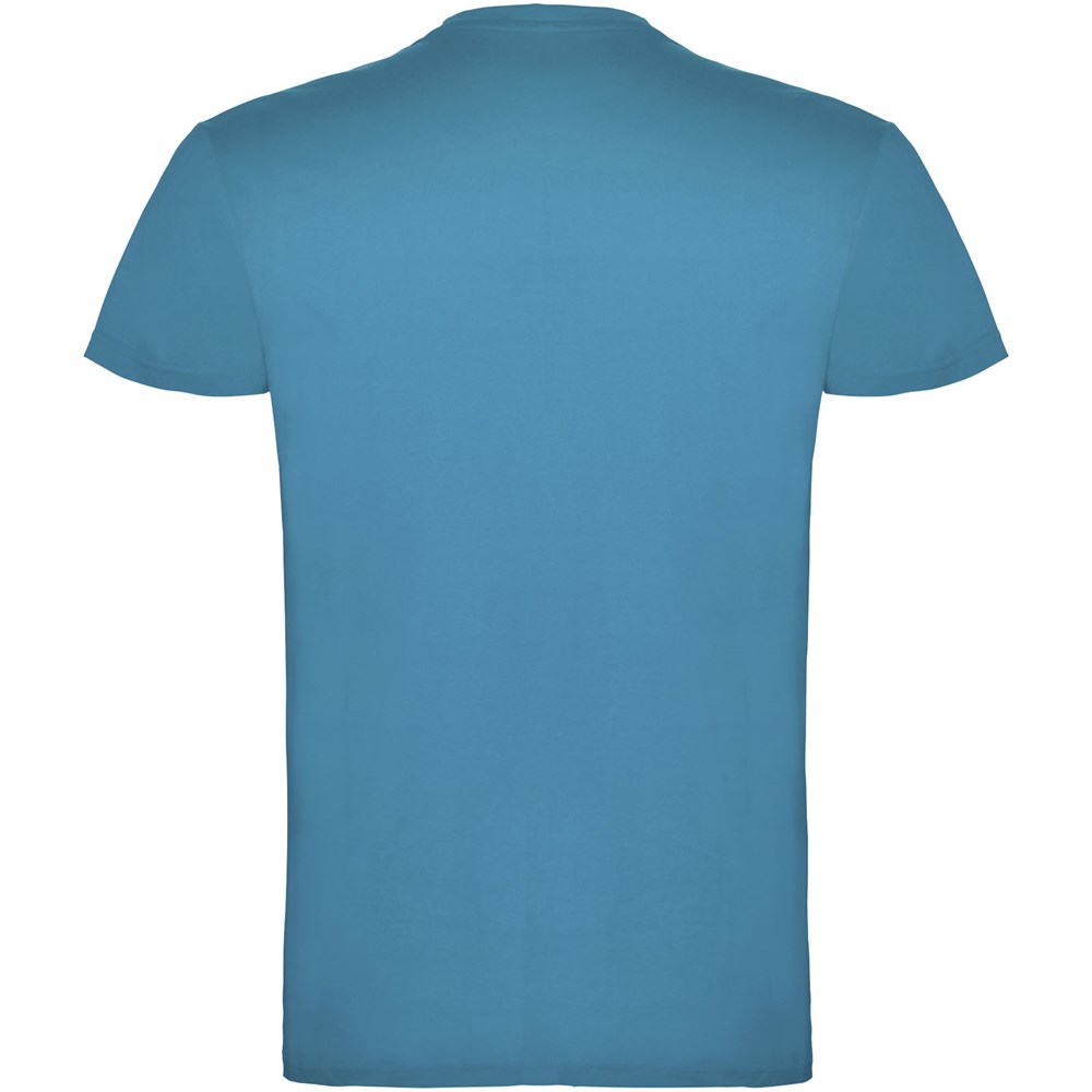 Kurzärmeliges T-Shirt mit doppellagigem Rundhalsausschnitt aus Elasthan, hergestellt aus schlauchförmigem Material für Erwachsene. Verstärkte und verdeckte Nähte am Kragen. Herausnehmbares Etikett. Das Modell ist 190 cm groß und trägt Größe L.
