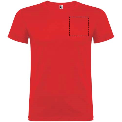 Kurzärmeliges T-Shirt mit doppellagigem Rundhalsausschnitt aus Elasthan, hergestellt aus schlauchförmigem Material für Erwachsene. Verstärkte und verdeckte Nähte am Kragen. Herausnehmbares Etikett. Das Modell ist 190 cm groß und trägt Größe L.