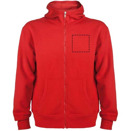 Sweatjacke mit Kapuze, hohem Halsausschnitt und durchgehendem Reißverschluss. Gerippte Details an Kapuze und Taschenpaspeln. Tasche im Känguru-Stil. 2×2 Rippenstrick an Ärmeln und Taille. Herausnehmbares Etikett. Das Modell ist 184 cm groß und trägt Größe L.