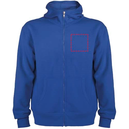 Sweatjacke mit Kapuze, hohem Halsausschnitt und durchgehendem Reißverschluss. Gerippte Details an Kapuze und Taschenpaspeln. Tasche im Känguru-Stil. 2×2 Rippenstrick an Ärmeln und Taille. Herausnehmbares Etikett. Das Modell ist 184 cm groß und trägt Größe L.