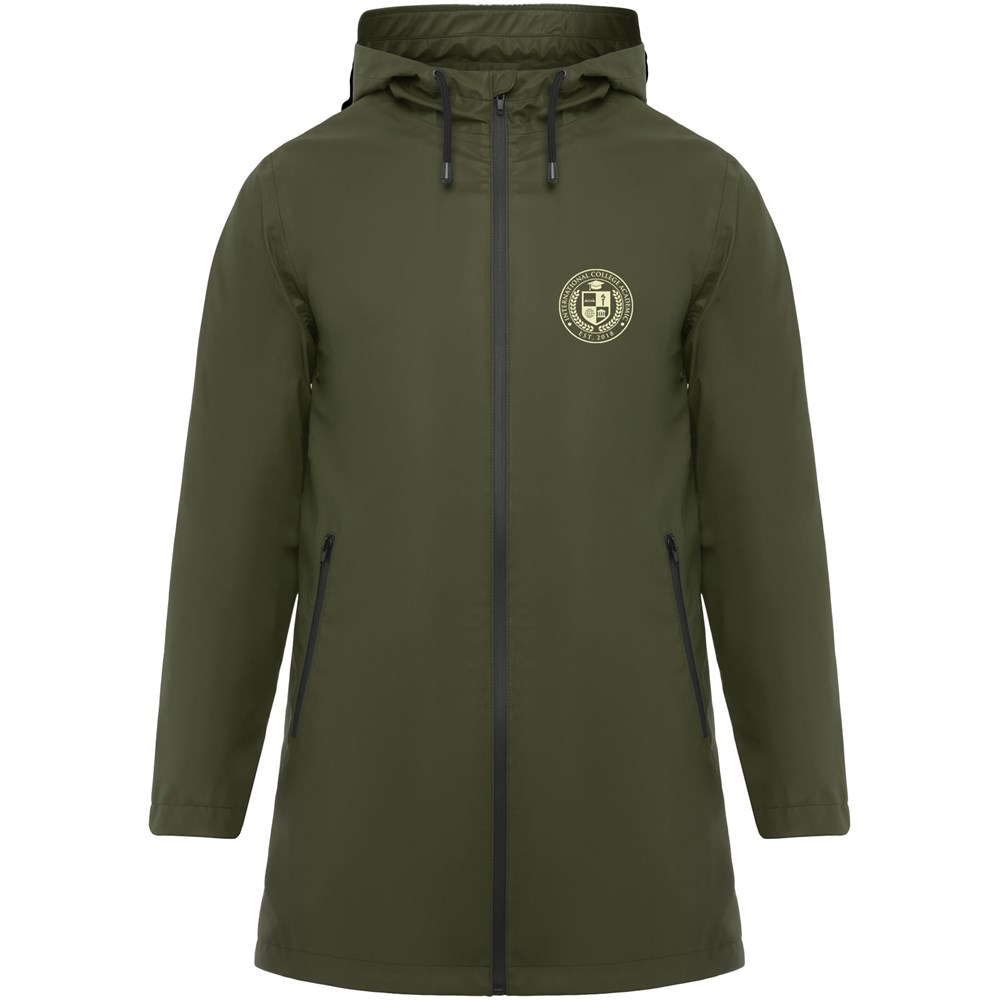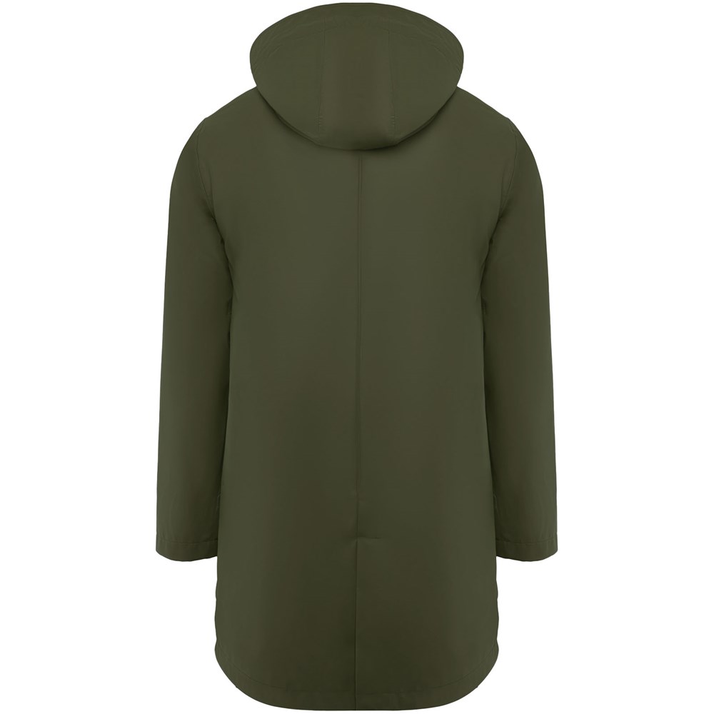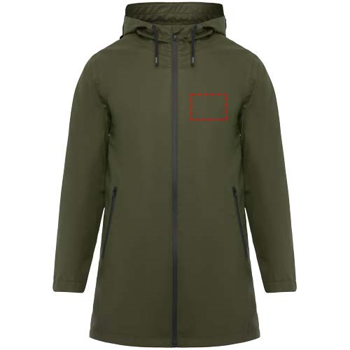 Wasserdichter Regenmantel. Kapuze mit Visier. Hitzeversiegelte Reißverschlüsse und Nähte. Kontrastierende Details in Schwarz. Zwei Seitentaschen mit Reißverschluss. Schlitz am hinteren Saum. Herausnehmbares Etikett. Wasserdicht. Das Modell ist 185 cm groß und trägt Größe M.