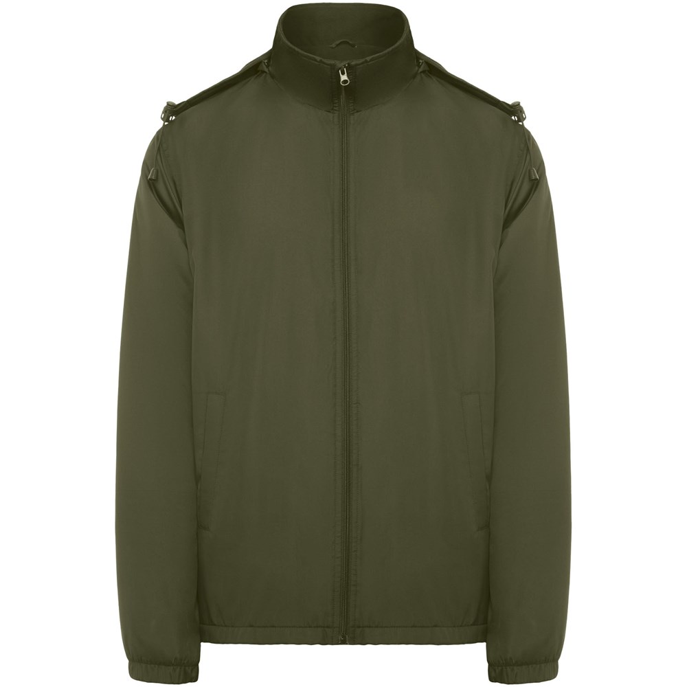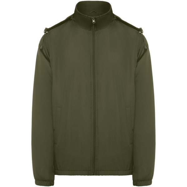 Leichte, wasserabweisende Jacke. Hoher Kragen und einrollbare, verstellbare Kapuze. Innenfutter aus Microfleece. Front-Reißverschluss und Kinnschutz. Elastische Ärmelbündchen. Zwei Seitentaschen mit Reißverschluss. Innere Brusttasche links. Herausnehmbares Etikett. Wasserabweisend. Winddicht. Das männliche Modell ist 184 cm groß und trägt Größe L, das weibliche Modell ist 174 cm groß und trägt Größe S.
