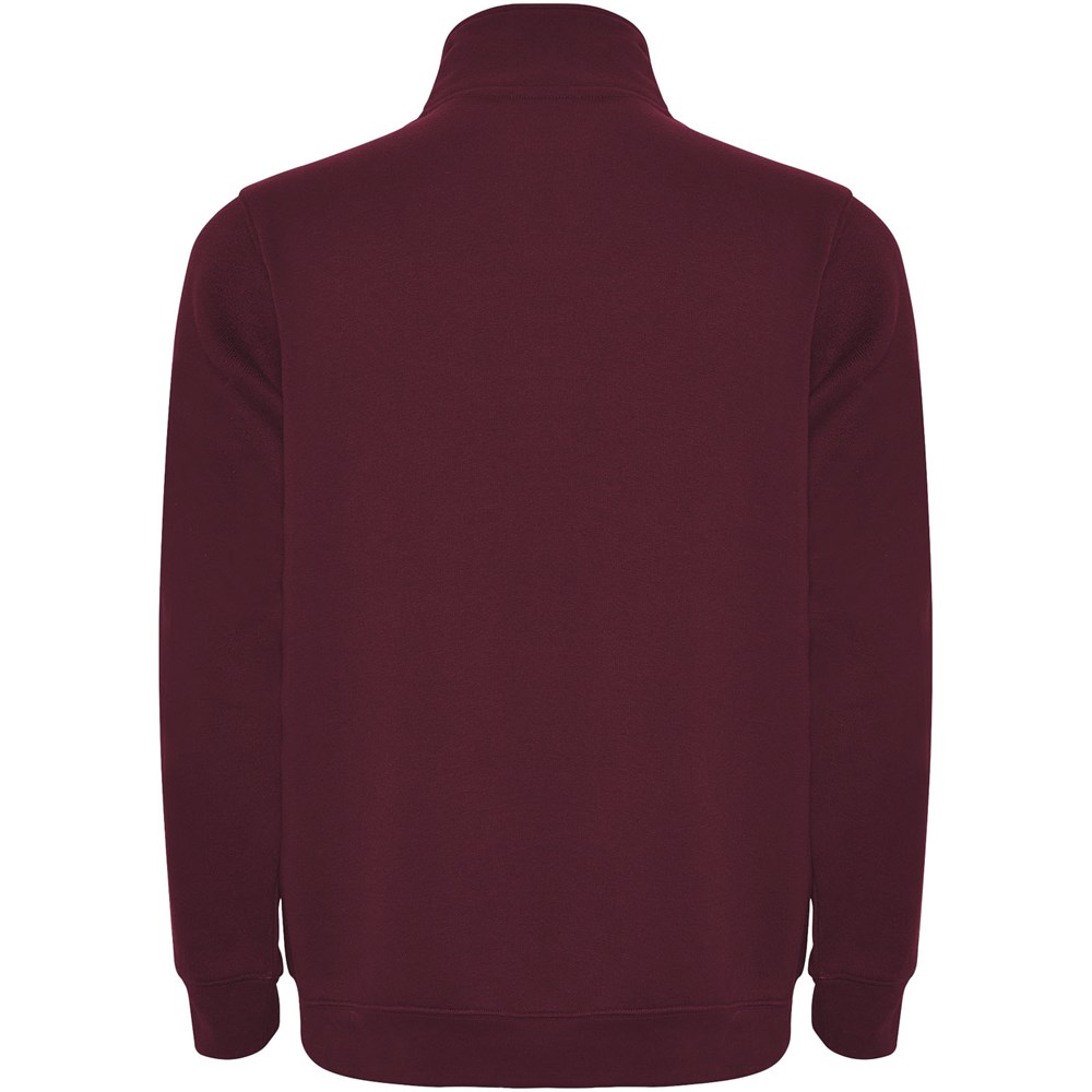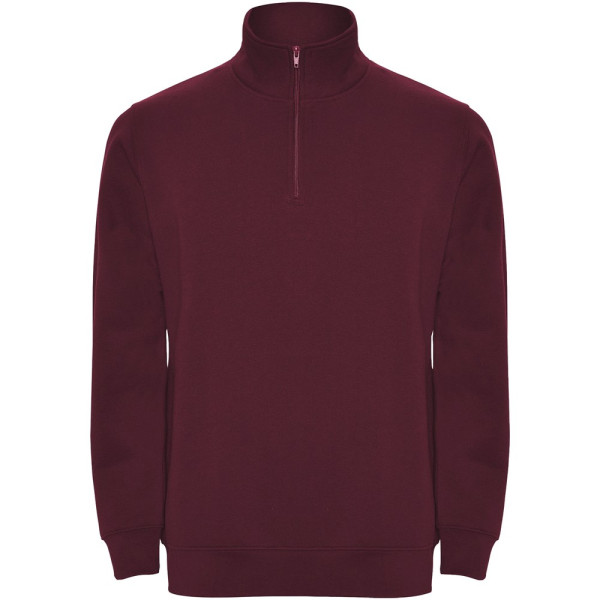 Sweatshirt mit passendem halben Reißverschluss und Polokragen. Passender Innenkragen. Verstärkte, abgedeckte Nähte am Innenkragen. 1×1 Rippbündchen an Ärmeln und Taille. Das Modell ist 185 cm groß und trägt Größe M.