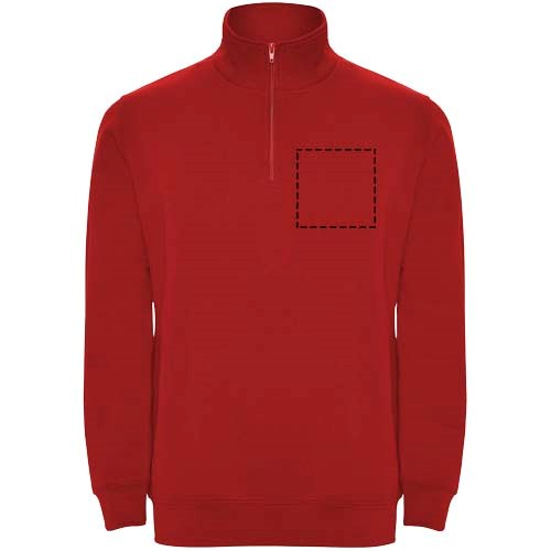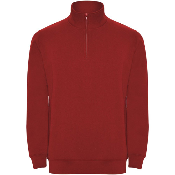 Sweatshirt mit passendem halben Reißverschluss und Polokragen. Passender Innenkragen. Verstärkte, abgedeckte Nähte am Innenkragen. 1×1 Rippbündchen an Ärmeln und Taille. Das Modell ist 185 cm groß und trägt Größe M.
