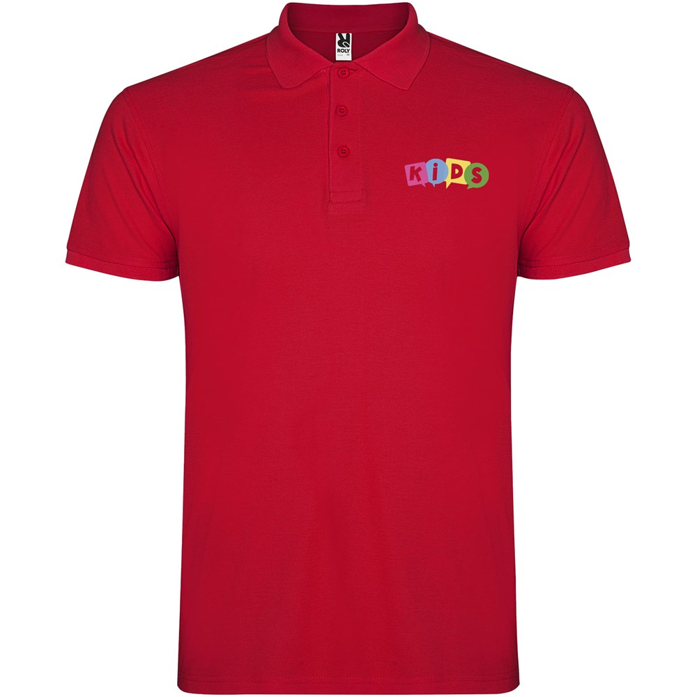 Kurzärmeliges Poloshirt für Kinder. Verstärkte und verdeckte Nähte am Innenkragen. 1x1 Rippstrickbündchen an Ärmeln und Kragen. Seitennähte. 3-Knopfleiste und Seitenschlitze. Optionale Tasche. Herausnehmbares Etikett. Das Modell ist 124 cm groß und trägt Größe 5/6.