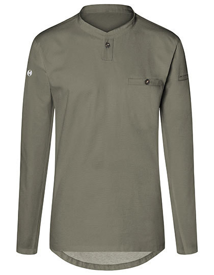 Vorderseite: Köpergewebe | Rückseite: Jersey-Piqué, atmungsaktiv, feuchtigkeitsregulierend | Langen Ärmel | Tailliert geschnitten | Halsausschnitt mit schmalem Stehkragen und kleiner Knopfleiste | Brustleistentasche mit Knopf | Leistentasche am linkem Ärmel