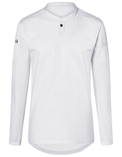 Vorderseite: Köpergewebe | Rückseite: Jersey-Piqué, atmungsaktiv, feuchtigkeitsregulierend | Lange Ärmel | Tailliert geschnitten | Halsausschnitt mit schmalem Stehkragen und kleiner Knopfleiste | Leistentasche am linkem Ärmel