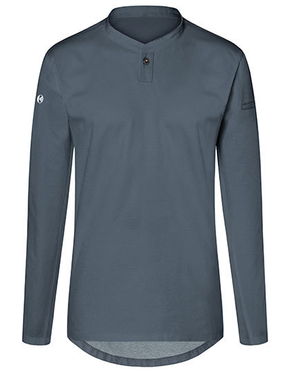 Vorderseite: Köpergewebe | Rückseite: Jersey-Piqué, atmungsaktiv, feuchtigkeitsregulierend | Lange Ärmel | Tailliert geschnitten | Halsausschnitt mit schmalem Stehkragen und kleiner Knopfleiste | Leistentasche am linkem Ärmel