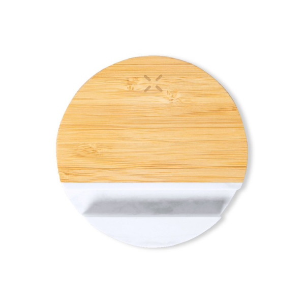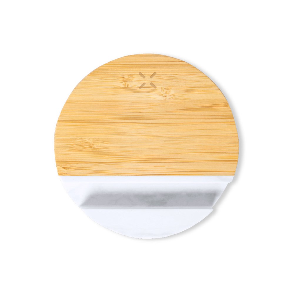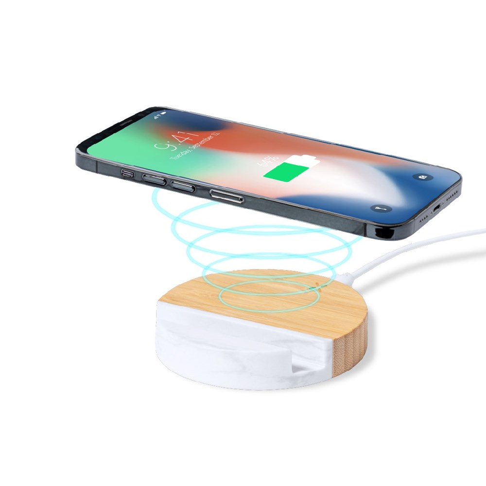 15W kabelloses Ladegerät mit integrierter Smartphone-Halterung. Rundes Design und aus natürlichen Materialien gefertigt: Bambusständer und Marmorextrakthalter. Kompatibel mit Geräten, die mit der kabellosen Qi-Ladetechnologie ausgestattet sind. Inklusive Typ-C-Ladekabel und Bedienungsanleitung in Englisch und Spanisch. Präsentiert in einer individuellen Kraft-Designbox. Hergestellt nach RoHS-Standards und unter Einhaltung der folgenden Sicherheitsanforderungen: Überhitzungsschutzsystem. Überladeschutzsystem. Blockiersystem zur Vermeidung von Kurzschlüssen.
