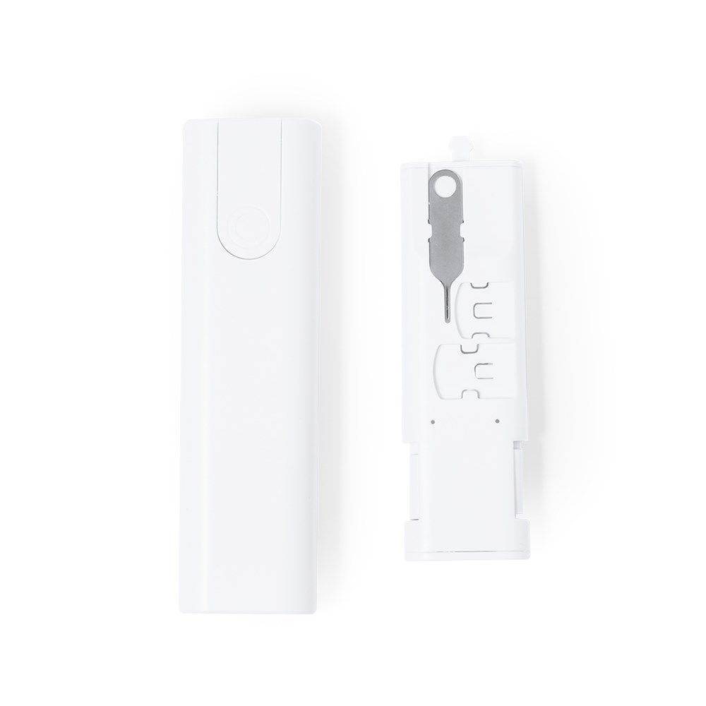 Kompletter Satz Ladekabel. Verpackt in einem kompakten Gehäuse aus widerstandsfähigem weißem ABS mit integrierter Smartphone-Halterung. Inklusive Ladegerät und Sync-Kabel, geeignet für die Datenübertragung und mehrere Verbindungen: Micro USB, Typ C und Lightning; SIM-Auswerfer enthalten. 5V DC 3A. Präsentiert in einer Kraft-Design-Box.