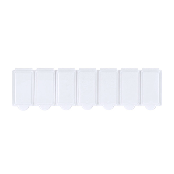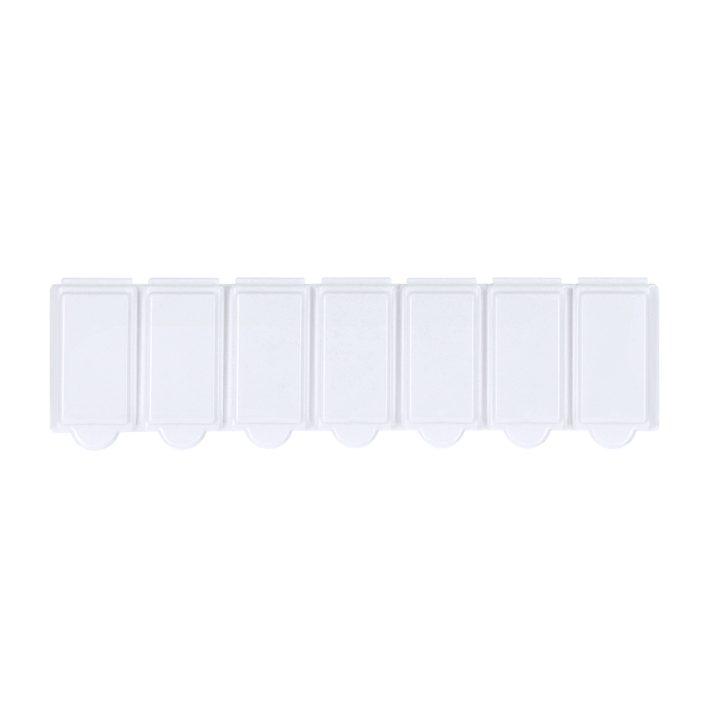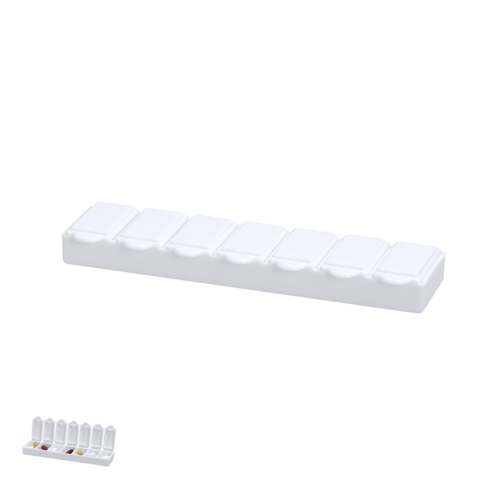 Wöchentlicher Pillenbehälter aus widerstandsfähigem PP in solider weißer Ausführung. Enthält 7 einzelne Fächer mit Sicherheitsverschluss. BPA-frei.