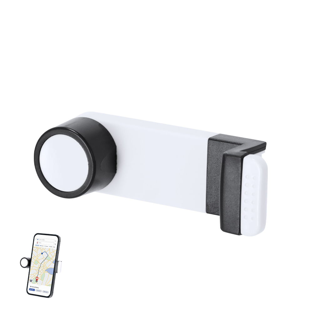 Smartphone-Halter mit minimalistischem Design in eleganter Schwarz/Weiß-Ausführung. Mit Befestigungssystem für die Autolüftung und runder Druckfläche - speziell für den Tampondruck entwickelt.