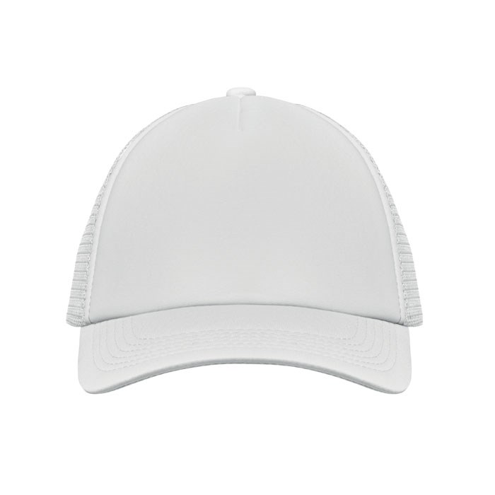 Trucker Kappe. 5 Panele. 140-150 gr/m2 Polyester. Verstellbarer Kunststoffverschluss. Weißes Frontpanel, farbiger Kappenschirm aus Polyester Jersey mit Schaum-Verstärkung. Weitere Panele aus Mesh. Größe 7 1/4.