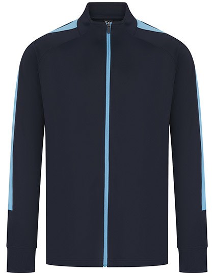 Sportanzugjacke aus Strickgewebe mit kontrastfarbenen äußeren Ärmeleinsätzen | Kontrastfarbener Front-Reißverschluss | Seitliche Taschen mit Reißverschluss | Trichterkragen und Elastische 1x1 Bündchen | Feststellschieber an allen Reißverschlüssen