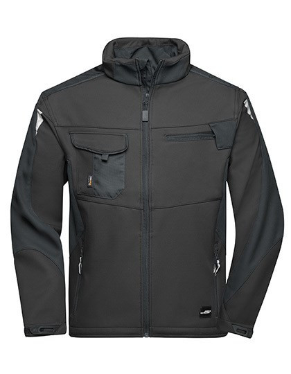 Robustes, strapazierfähiges Softshell-Material | Wind- und wasserabweisend (2.000 mm Wassersäule) | Atmungsaktiv und wasserdampfdurchlässig (2.000 g/m²/24h) | Stehkragen | Schulterbereich mit CORDURA® verstärkt | Durchgehend unterlegter Reißverschluss mit Windschutzblende | Seitentaschen und Brusttasche mit Reißverschluss | Brusttasche mit Klappe, Innentaschen | Reflektions-Elemente (ohne Schutzfunktion/keine PSA) am Arm und Rückenteil