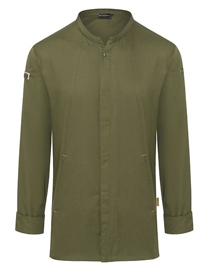 Vorderseite: Köpergewebe, 150 g/m² | Rückseite: Jersey-Piqué, 170 g/m², atmungsaktiv, feuchtigkeitsregulierend | Innovative nachhaltige Kochjacke, die urbanen Style mit natürlichem Flair verbindet | Der Artikel enthält 72% recyceltes Polyester und wurde umweltverträglich und sozial verantwortlich produziert | Leicht tailliert geschnitten | Rückeneinsatz aus Jersey-Piqué sorgt für angenehme Belüftung und erhöhte Bewegungsfreiheit | mit Druckknöpfen zum schnellen Öffnen und Schließen | Ärmelmanschetten mit Druckknöpfen | Vorderteil mit Reißverschlußtaschen und Leistentasche am linken Ärmel | stylische Applikationen aus Kontrastbändern an den Ärmeln und im Nacken für eine urbane Optik | Grüner Knopf zertifiziert, www.g-k.eu/karlowsky