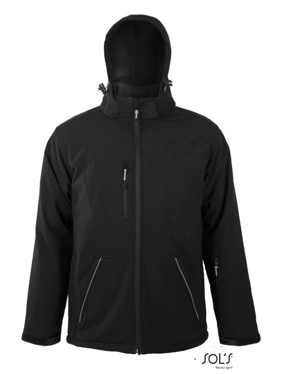 8000 mm Wassersäule | Atmungsaktive Membran | Futtertaft: 100% Polyester | Füllung: 100% Polyester 160gsm | Vollständig wattierte Softshelljacke für Herren | Abnehmbare Kapuze mit Kapuzenschirm, einstellbar mit zwei Zugkordeln mit Stoppern und Klettverschluss | Drei Fronsttaschen mit Reißverschluss | Eine Reißverschluss-Ärmeltasche | Eine Reißverschluss-Innentasche | Eine Mesh-Innentasche | Verstellbare Ärmelbündchen mit Klett-Patte und inneren Stretch-Bündchen | Elastischer Kordelzug am Bund