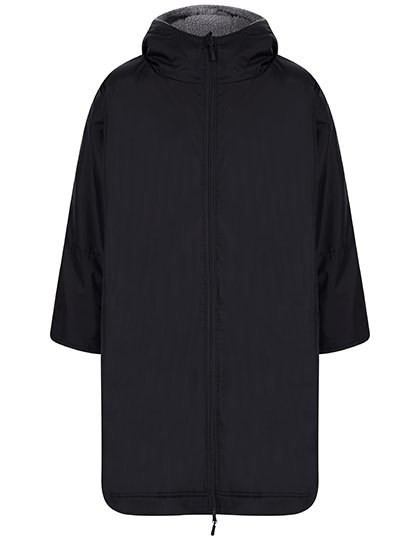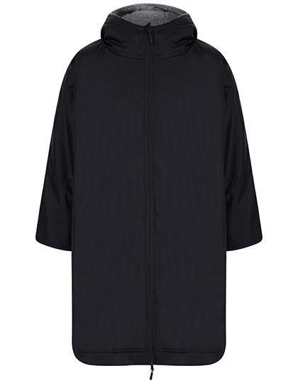 Außen: 100% Nylon 130 g/m², Innen: 100% Polyester-Sherpa-Fleece 280 g/m² | Wasserabweisendes Gewebe bis zu 4.000 mm | Hellgraues Sherpa-Fleece-Futter | Große Gestaltungsfläche | Mit Kapuze | Langärmeliges Design mit verstellbarem Klettverschluss am Armabschluss | Einheitsgröße – 104 cm Länge, 82 cm halbe Brust | Zwei, mit Mikrofleece gefütterte, Taschen vorne | Innentasche mit Reißverschluss | Aufgesetzte Tasche innen | Zwei-Wege-Reißverschluss für Bewegungsfreiheit mit Mikrofleece-Vorderseite | Ohne Logo für einfaches Umlabeln | Veredelungszugang mit verstecktem Reißverschluss